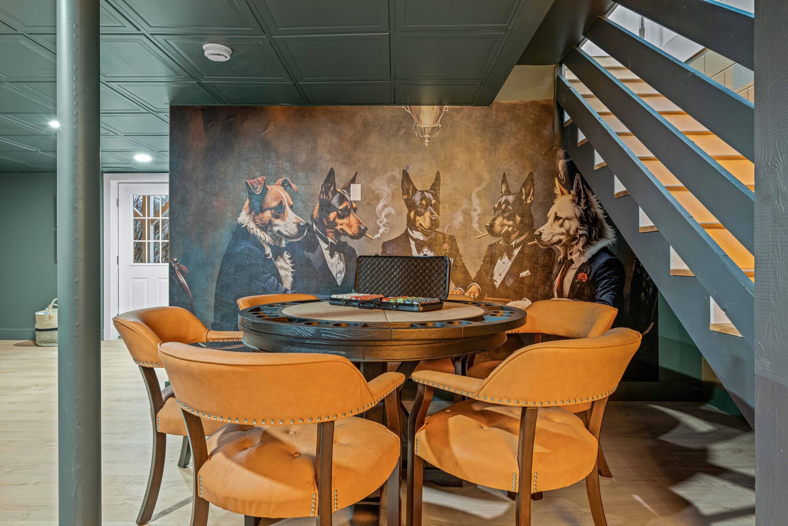 One of the house’s biggest highlights is its variety of indoor entertainment spaces. The basement features two separate game areas. This guarantees that everyone will find something they enjoy. From a poker table and pool table to shuffleboard and various arcade games. There is plenty to keep you and everyone else entertained.